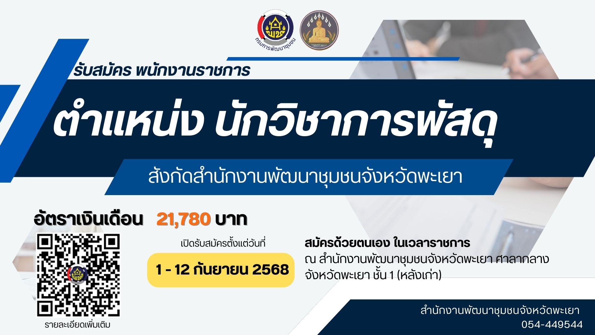 ประกาศจังหวัดพะเยา เรื่อง รับสมัครบุคคลเพื่อสรรหาและเลือกสรรเป็นพนักงานราชการทั่วไป สังกัดสำนักงานพัฒนาชุมชนจังหวัดพะเยา ตำแหน่งนักวิชาการพัสดุ