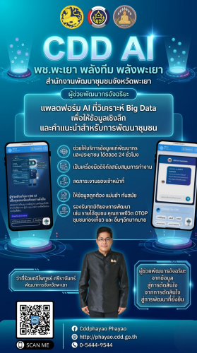📢 สำนักงานพัฒนาชุมชนจังหวัดพะเยา ขอประชาสัมพันธ์การใช้งาน CDD AI ผู้ช่วยอัจฉริยะ เครื่องมือดิจิทัลจากกรมการพัฒนาชุมชน ที่ช่วยยกระดับการทำงานด้านการพัฒนาชุมชนให้มีประสิทธิภาพมากยิ่งขึ้น 🤖